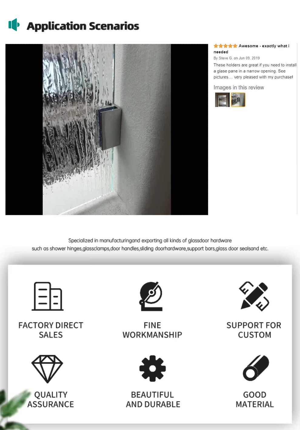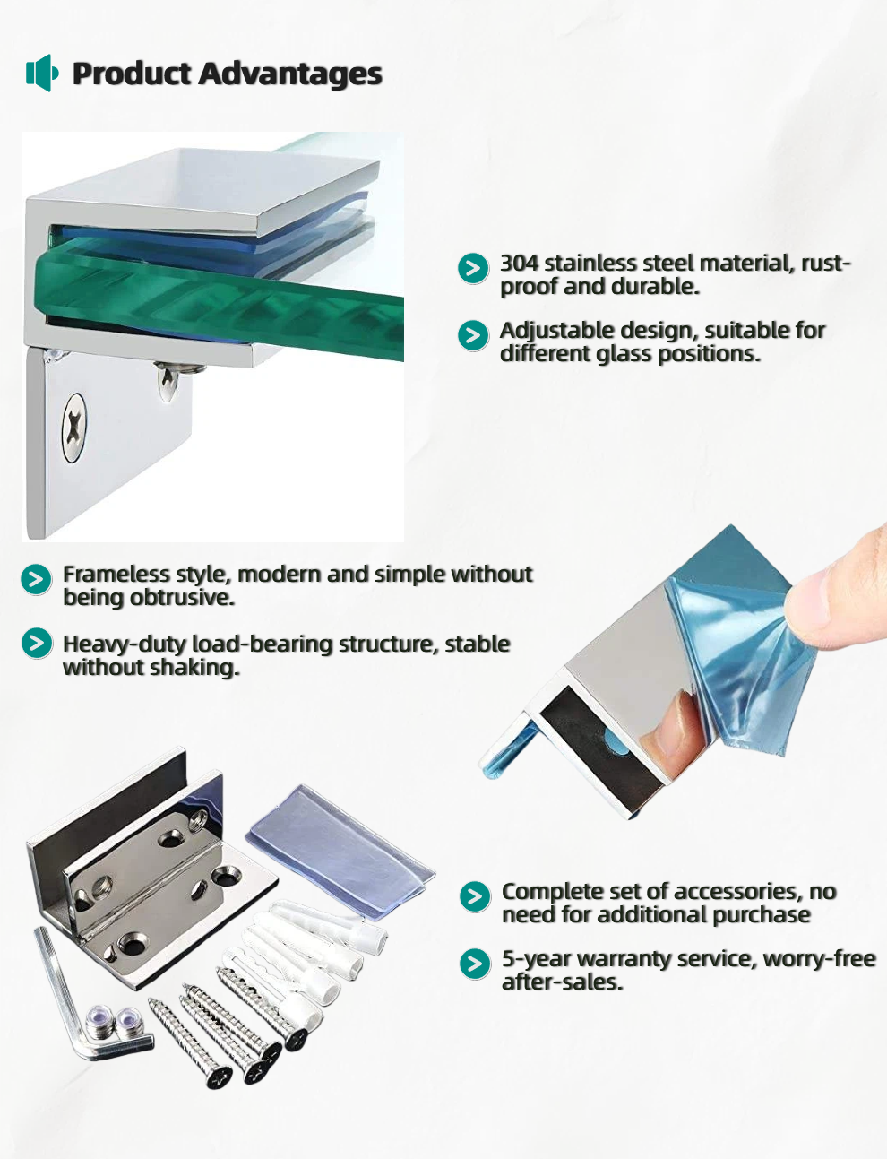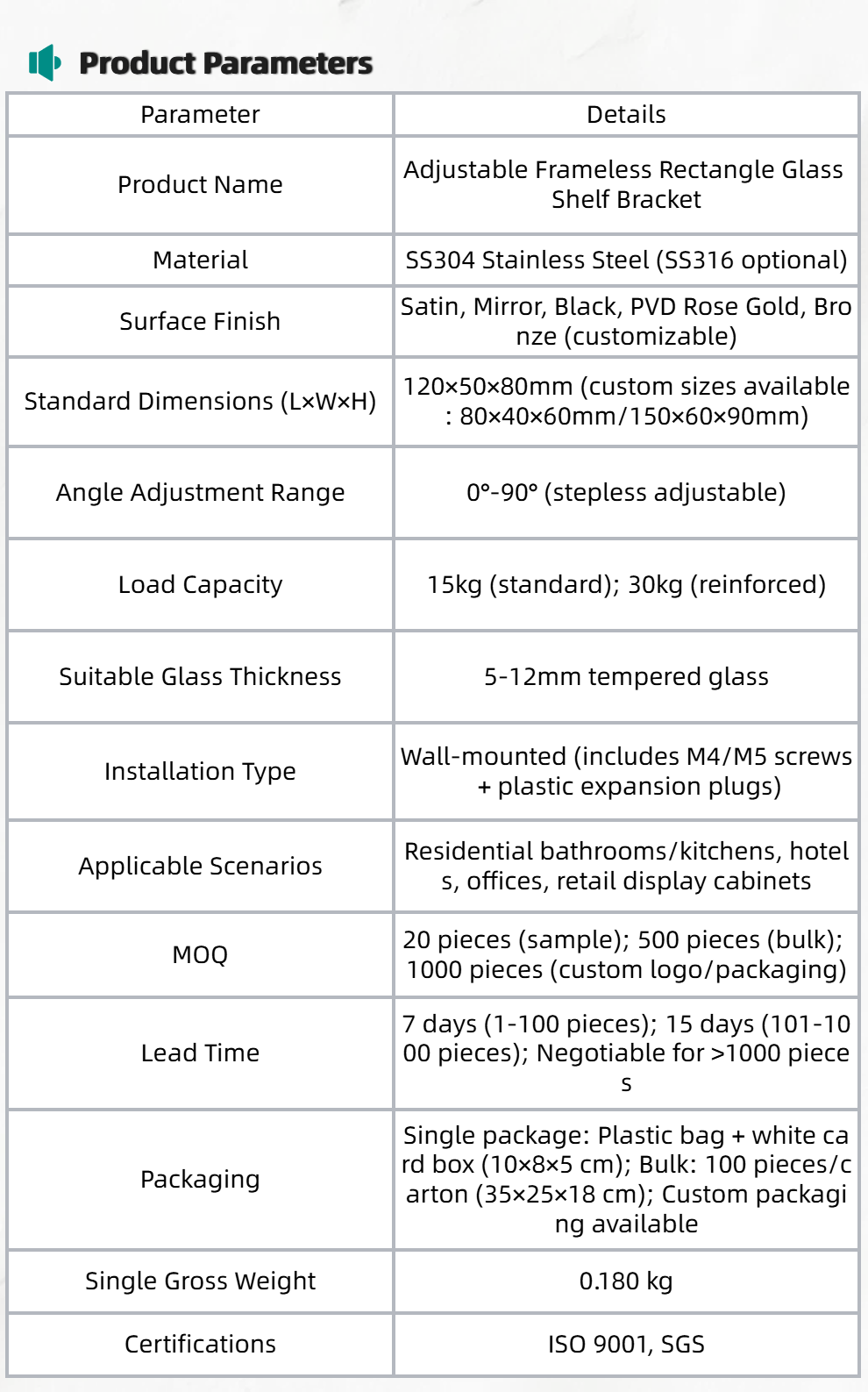 Angle Adjustability Range: Beyond standard 90° fixed angle, supports stepless adjustment (0°-90°) to fit sloped walls or tilted glass shelf needs (e.g., bathroom corner shelves, kitchen spice racks).