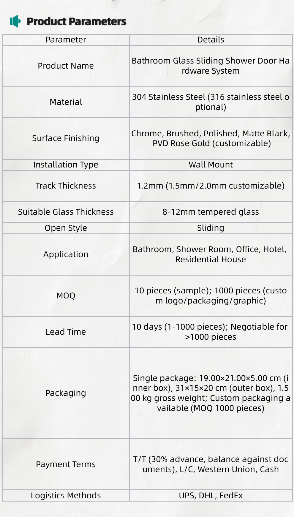 Thickness Customization: Supports customized track thickness (1.2mm standard, 1.5mm/2.0mm optional) to match different glass weights, ensuring better load-bearing stability for heavy 12mm glass doors.