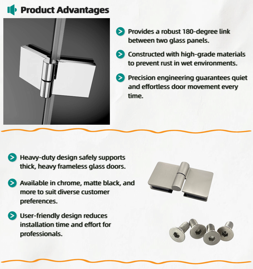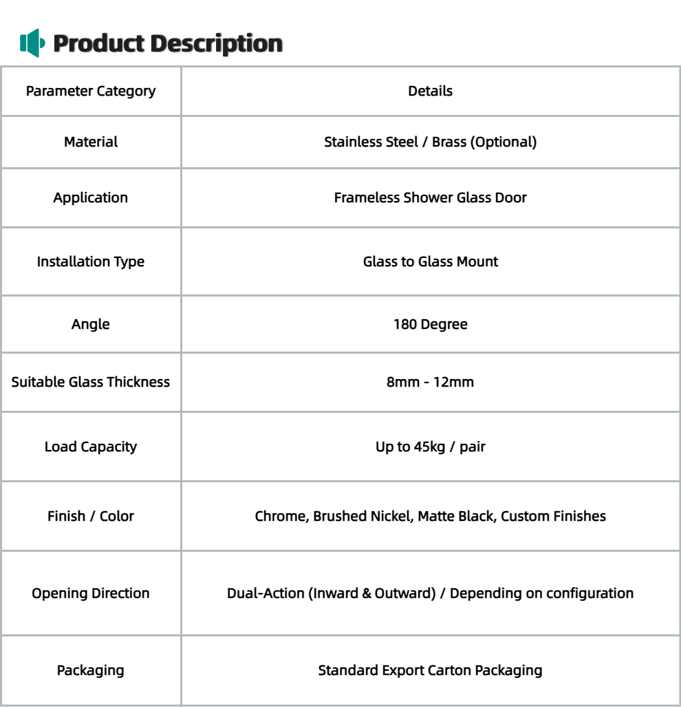 Bathroom Glass to Glass Hinges 180 Degree Brass Adjustable Glass Door Pivot Lift Hinge Material:Premium stainless steel or brass, anti-corrosion and rust-resistant Structure:180-degree glass-to-glass seamless connection Application:Designed for frameless glass shower doors Load Capacity:Sturdy construction with high load-bearing performance 180DegreeHinge , ShowerHardware , GlassToGlassHinge , FramelessShower Inquiry Send Email