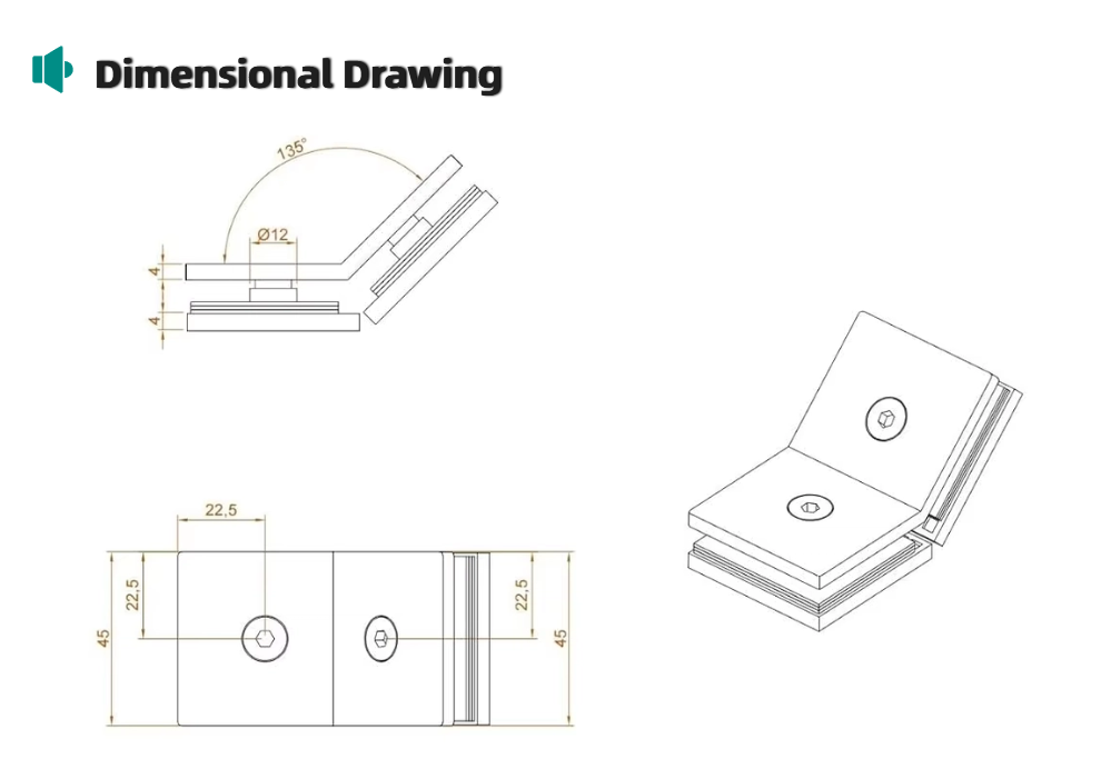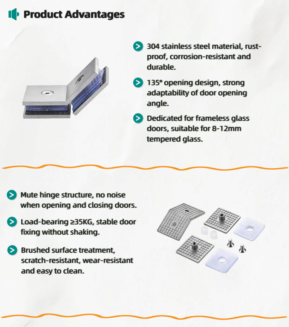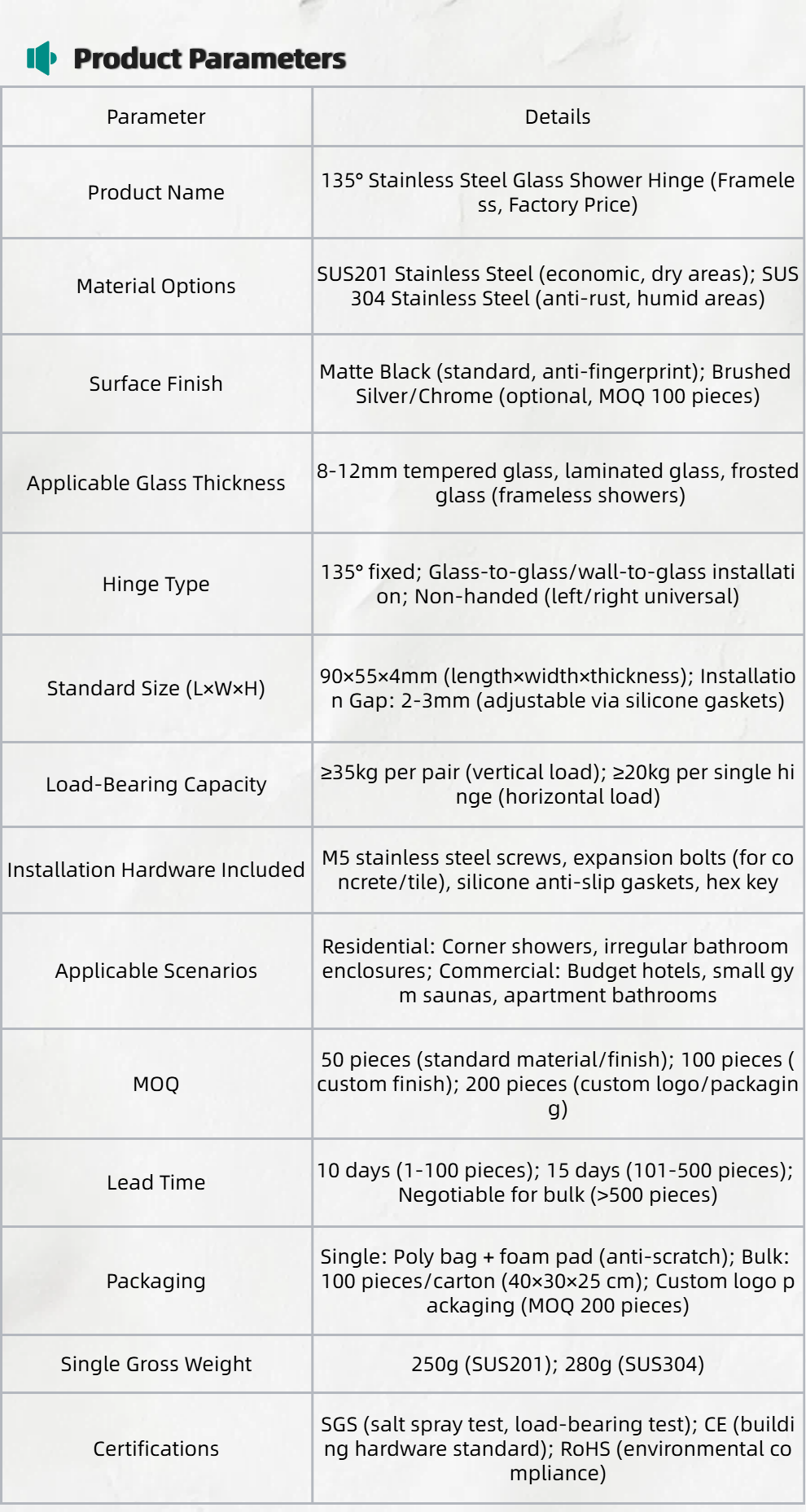 135° Fixed Angle Design: Engineered for non-right-angle frameless shower enclosures (e.g., corner showers, sloped walls)—ensures tight glass-to-glass or glass-to-wall connection with no gaps. Perfect
