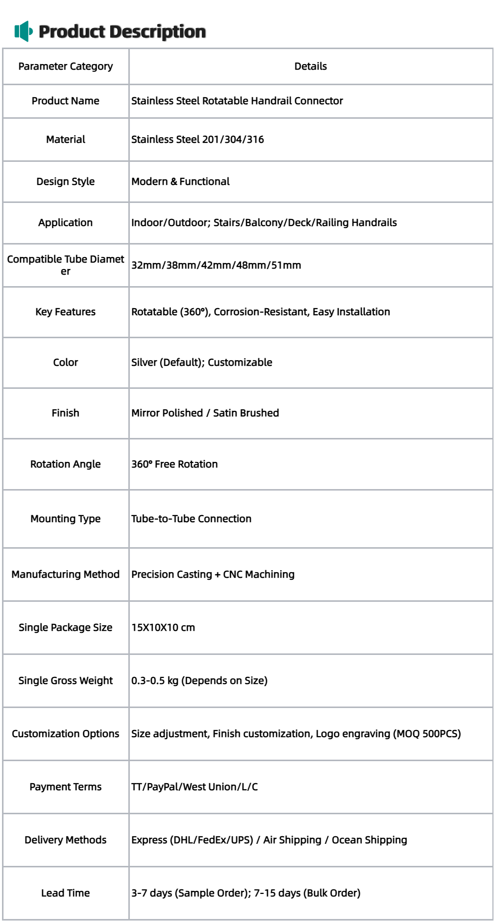 Chinese Stainless Steel Rotatable Handrail Connector - 360° Rotatable Design: Flexible angle adjustment for multi-scenario use - High-Compatibility Fit: Works with 32-51mm diameter handrail tubes - Premium Stainless Steel Build: 201/304/316 material for corrosion resistance - Universal Application: Suitable for indoor/outdoor railings & handrails Handrail Connector , Rotatable Railing Fitting , Stainless Steel Connector , Universal Handrail Accessory Inquiry Send Email