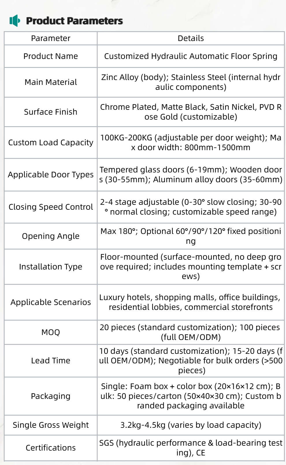 Full Customization Capability: Supports tailored adjustments for load capacity, closing speed, and surface finish—adapting to non-standard door sizes (e.g., oversized mall doors) or unique project nee