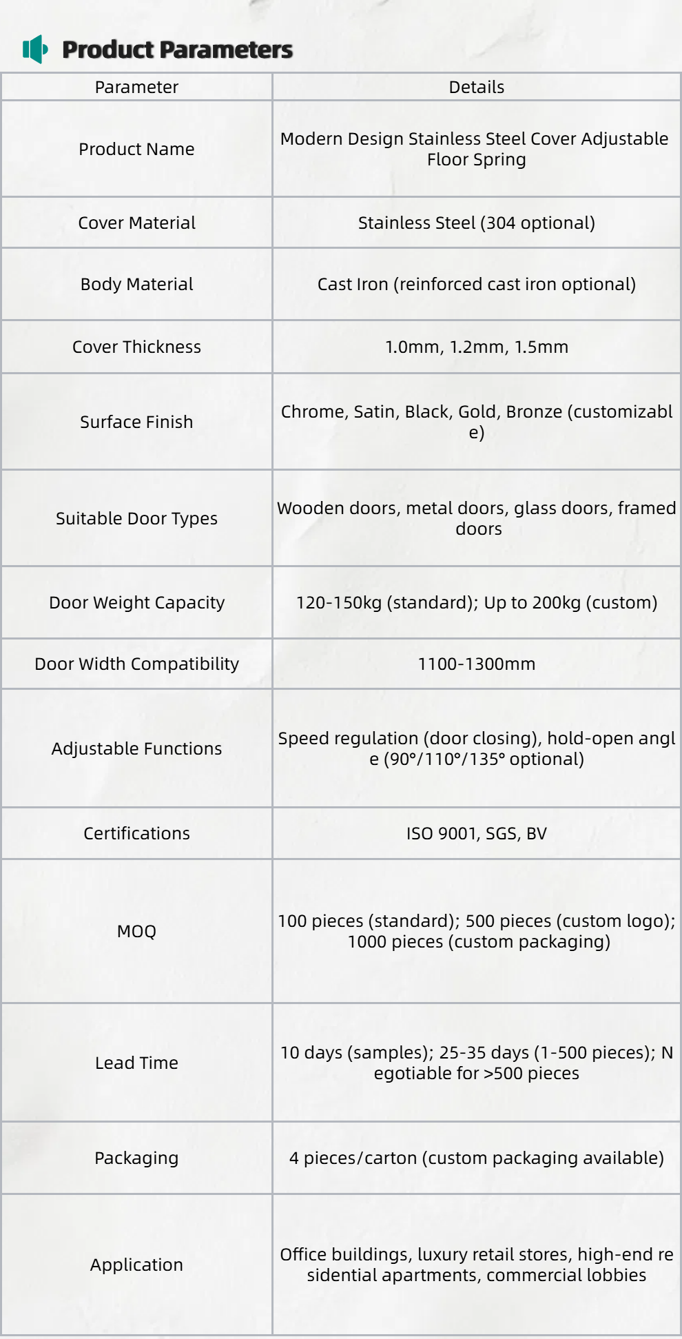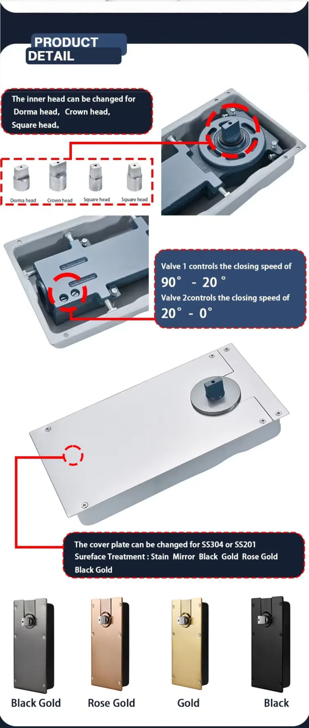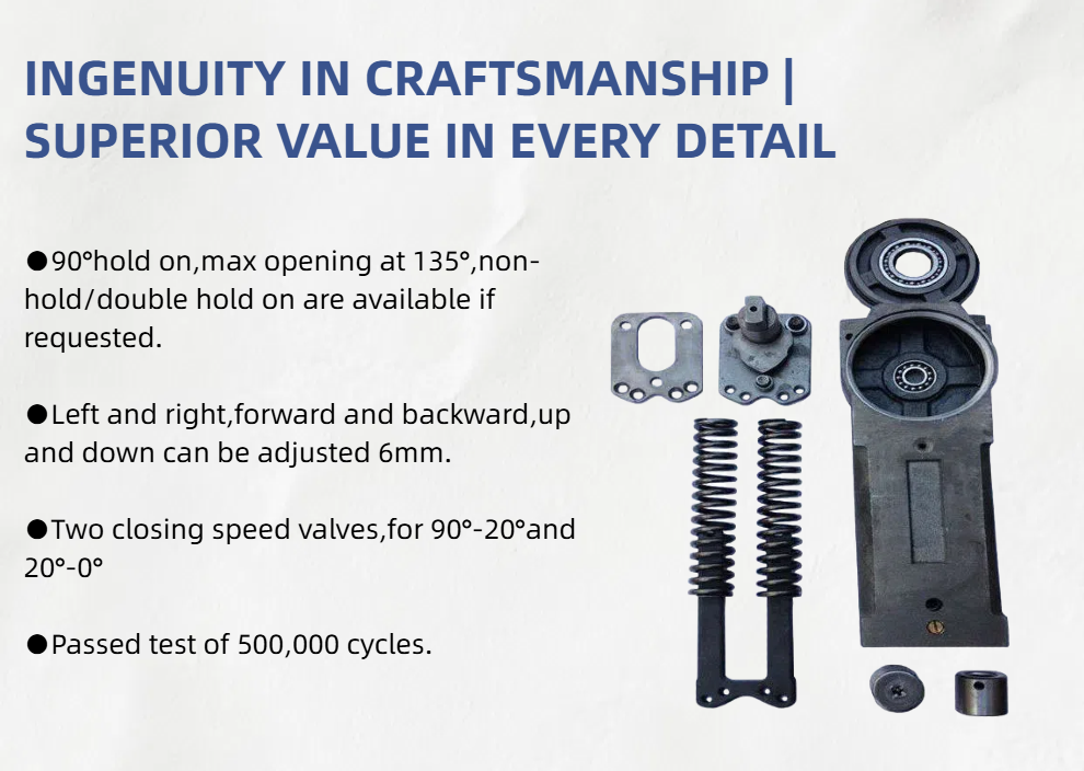 Door Weight Adaptation: Customizable internal spring tension to support door weights beyond 120-150kg (up to 200kg), suitable for heavy glass or metal doors in commercial buildings.