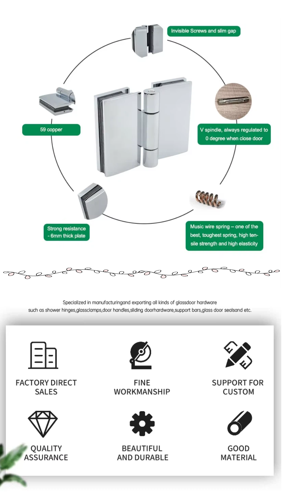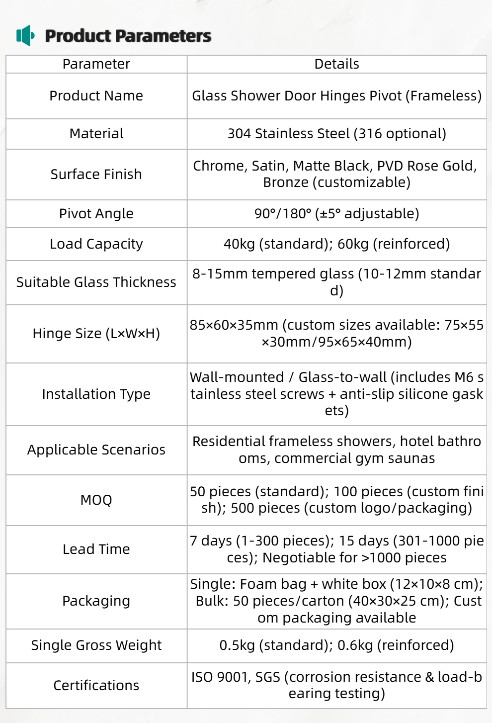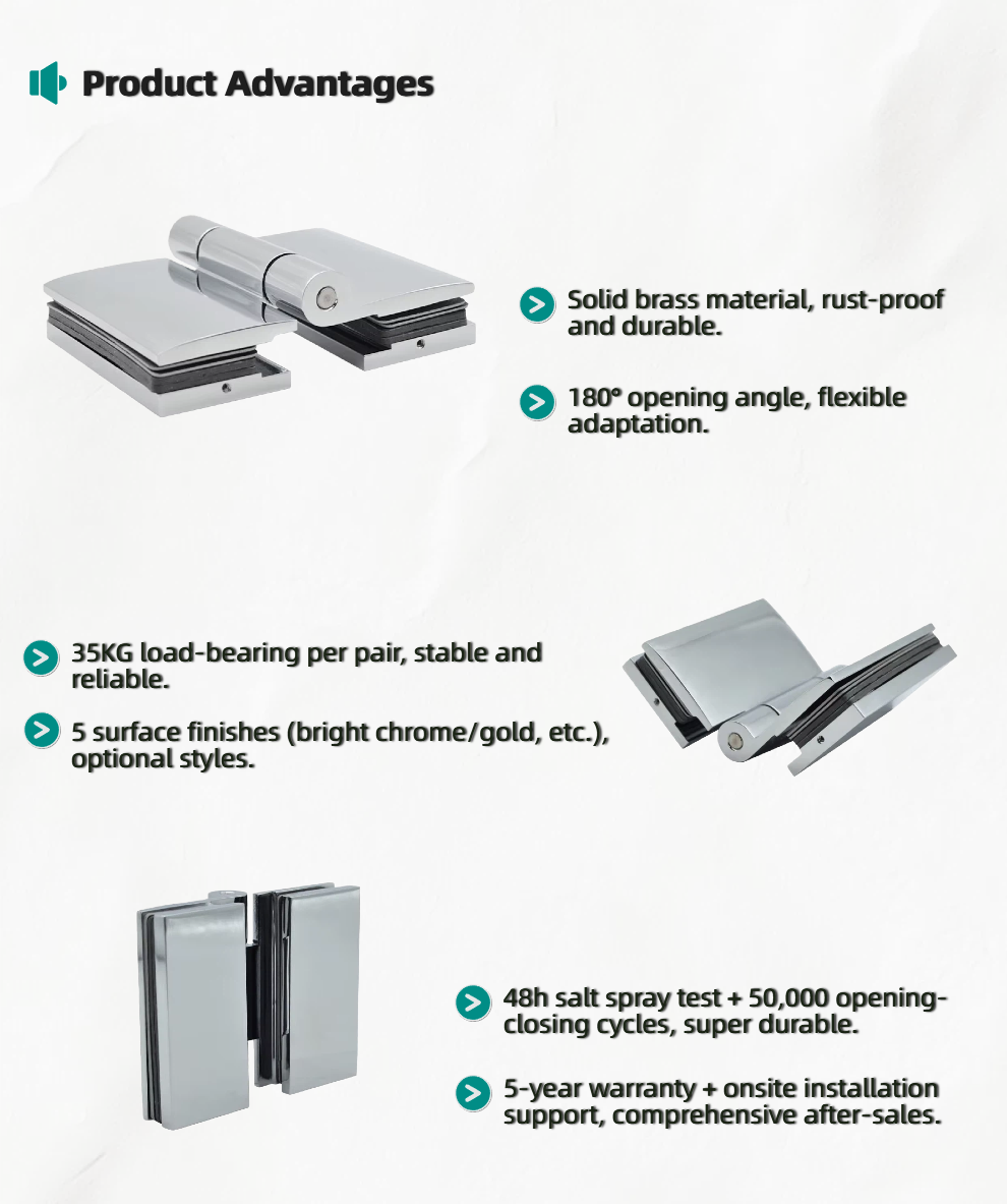 Load Capacity Customization: Reinforced hinge structure (optional) to increase load capacity from 40kg (standard) to 60kg, suitable for heavy 12-15mm tempered glass shower doors in commercial spaces.