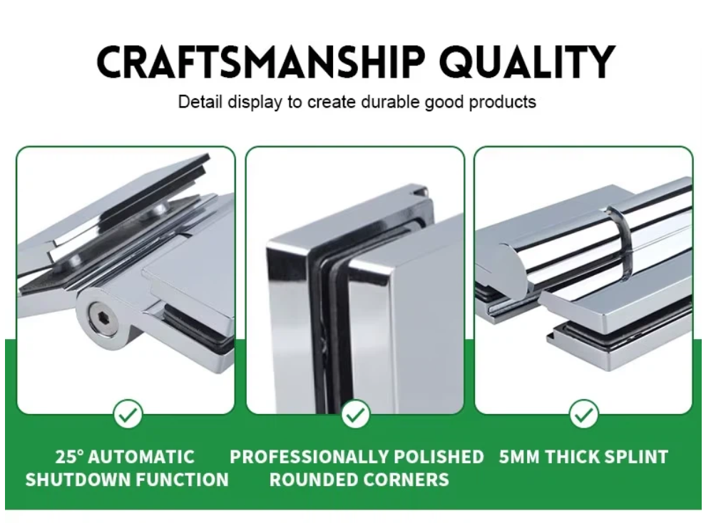 Pivot Angle Adjustment: Beyond standard 90°/180° fixed angles, supports ±5° fine-tuning to fit slightly uneven wall or glass surfaces, ensuring seamless alignment for frameless shower doors.