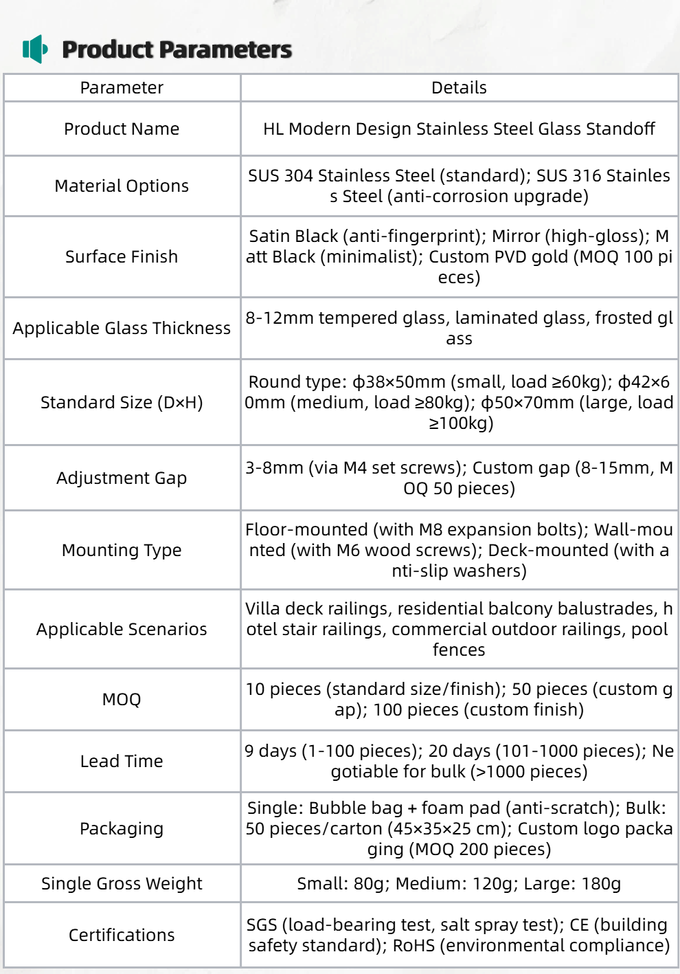 HL Modern Design Stainless Steel Glass Standoff Accessories Customizable Factory Adjustment for Deck Railings Balustrade