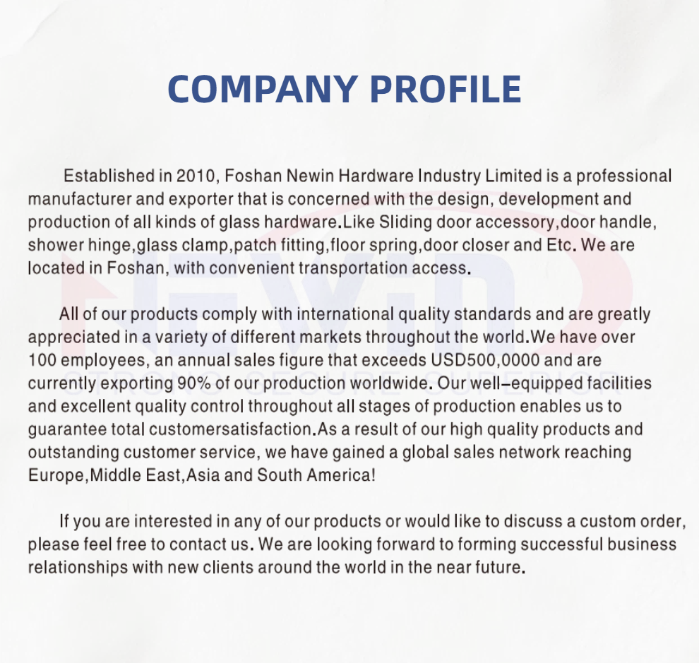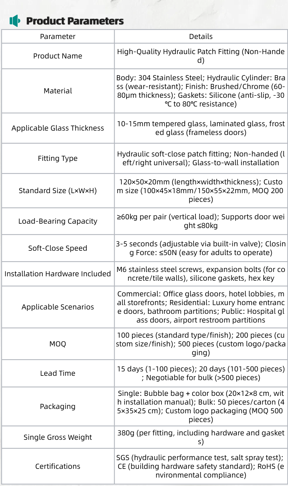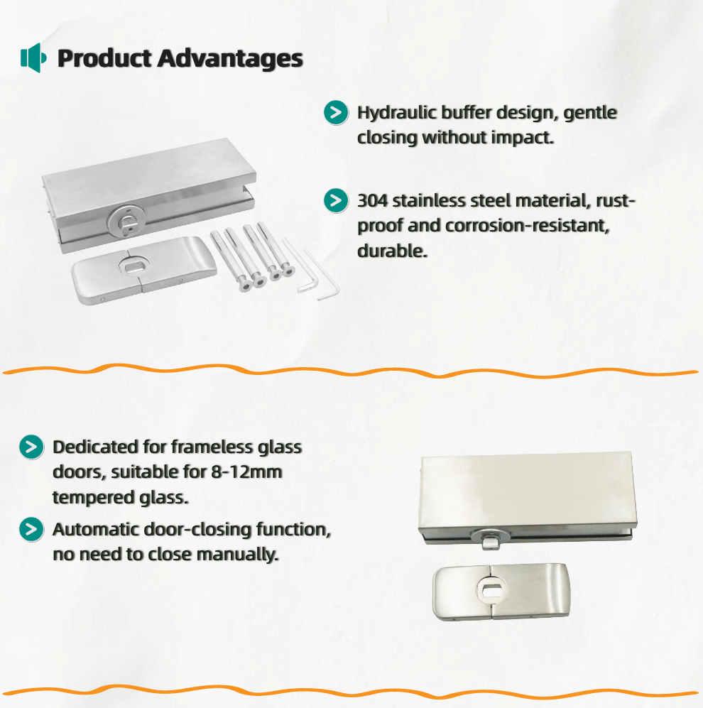 Hydraulic Damping Technology: Built-in hydraulic cylinder for soft-close operation—glass doors close slowly (3-5 seconds) without slamming, reducing impact on glass edges and extending service life. I