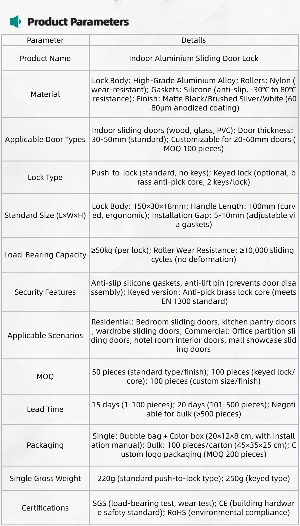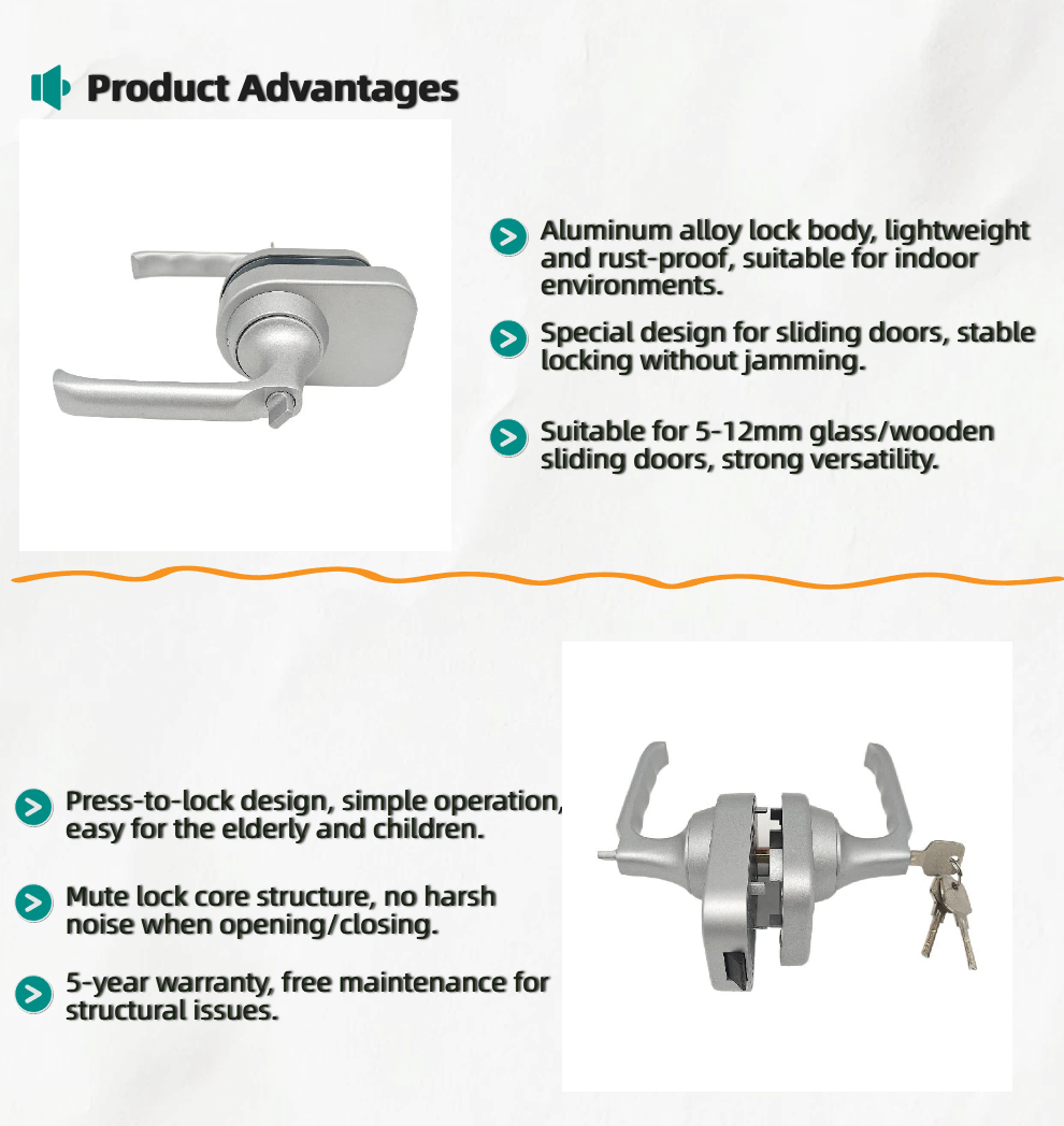 Indoor-Specific Lightweight Design: Made of high-grade aluminium alloy (density 2.7g/cm³) — 30% lighter than stainless steel locks, reducing door track load while maintaining structural stability (≥50
