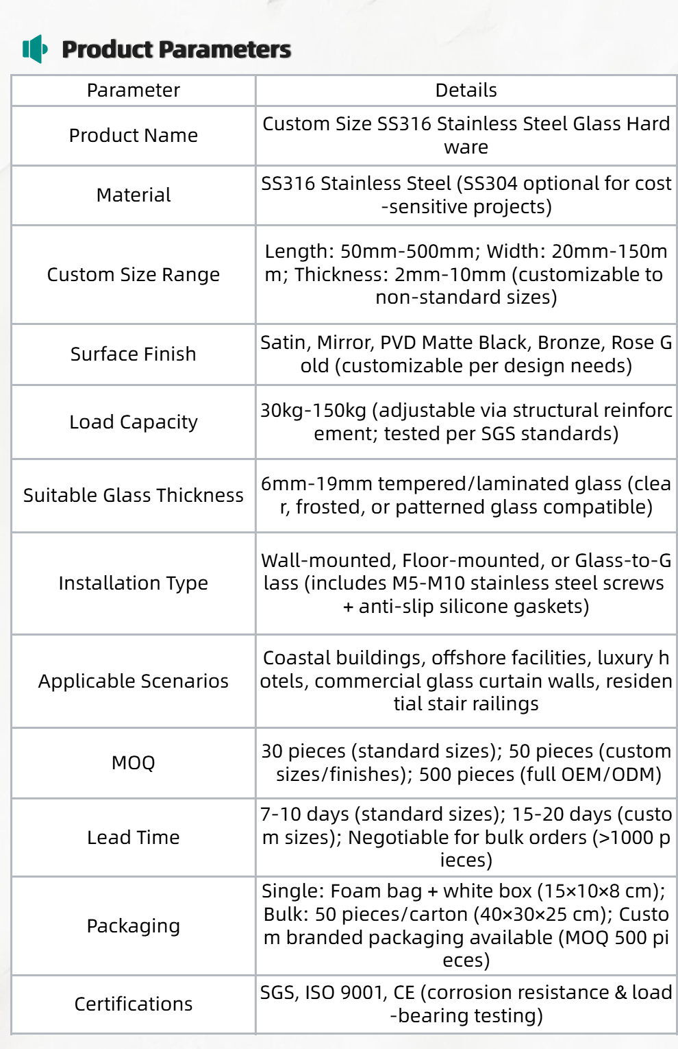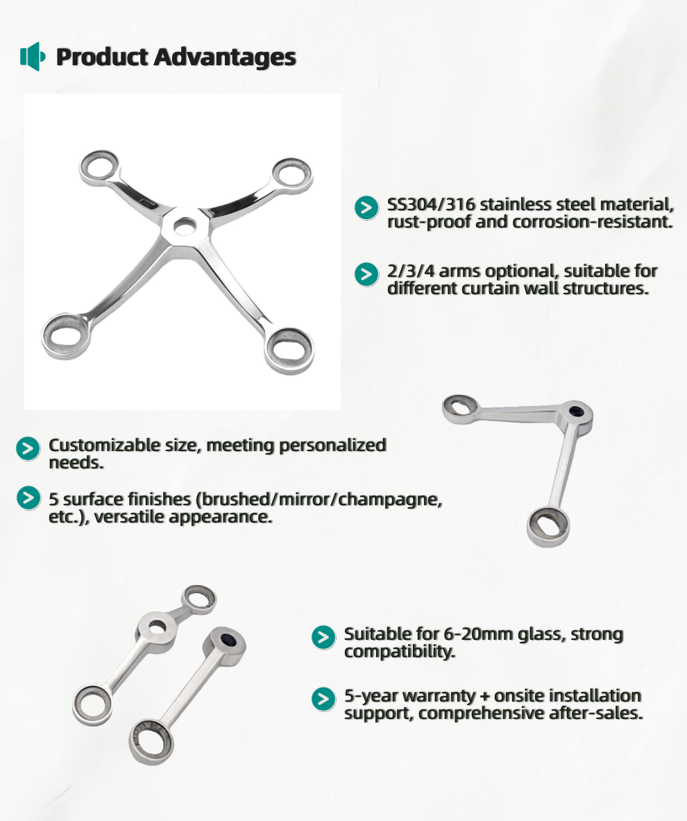 Wide Application Scope: Compatible with glass railings, curtain walls, shower enclosures, and stair glass partitions; fits both residential and commercial high-end projects (luxury hotels, coastal vil