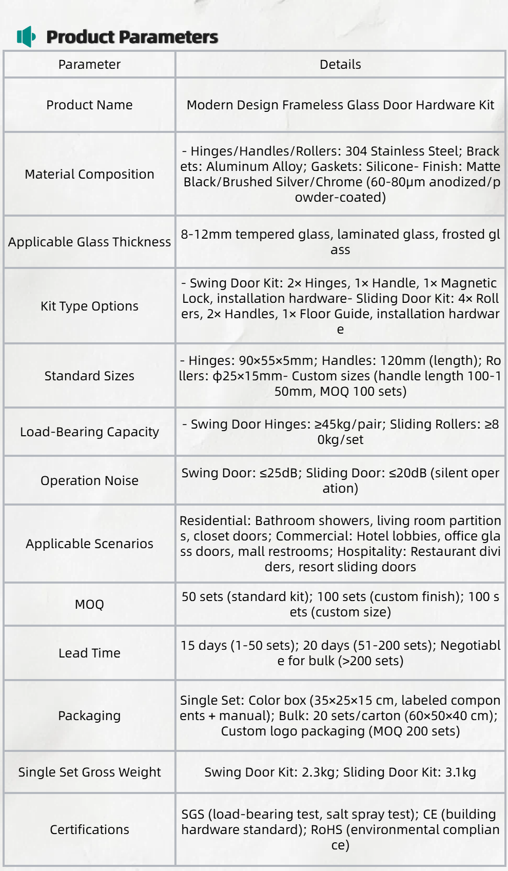 Frameless Minimalist Aesthetic: Slim-profile hardware (thickness ≤18mm) with no bulky frames—preserves glass transparency and maximizes space visibility. Available in matte black, brushed silver, and