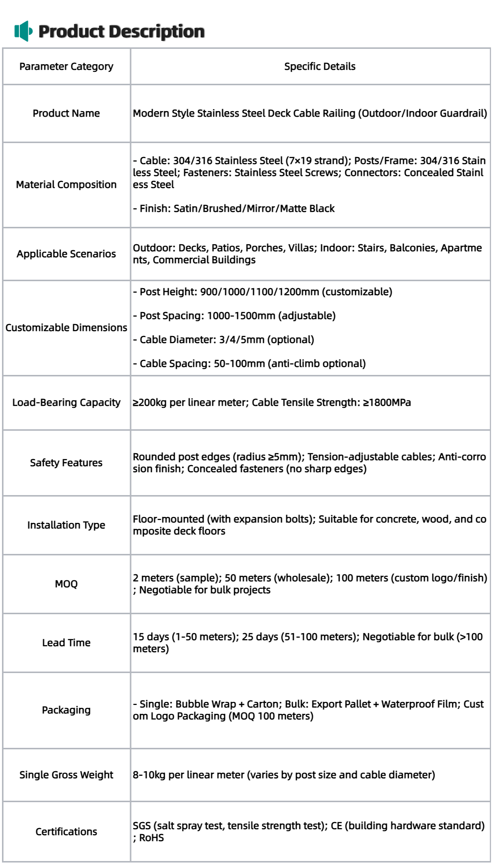 High-Strength Stainless Steel Cable: Made of 304/316 stainless steel cable (7×19 strand structure)—anti-rust, corrosion-resistant, and tensile strength ≥1800MPa. Suitable for outdoor decks, stairs, an