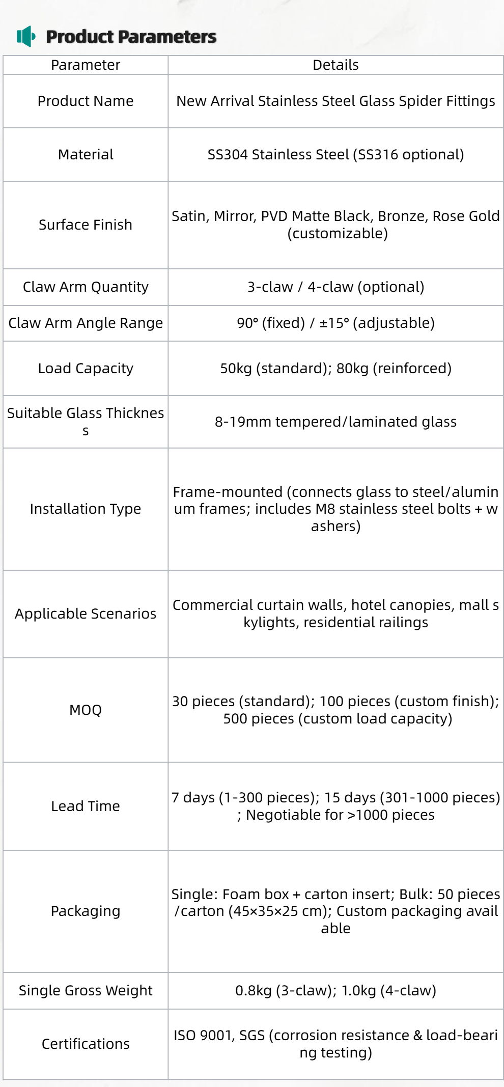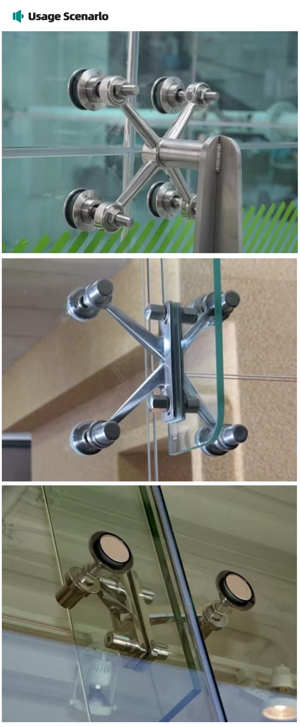 Load Capacity Customization: Reinforced claw & base design (optional) to increase load capacity from 50kg (standard) to 80kg per fitting, suitable for thick 12-19mm tempered laminated glass in high-ri