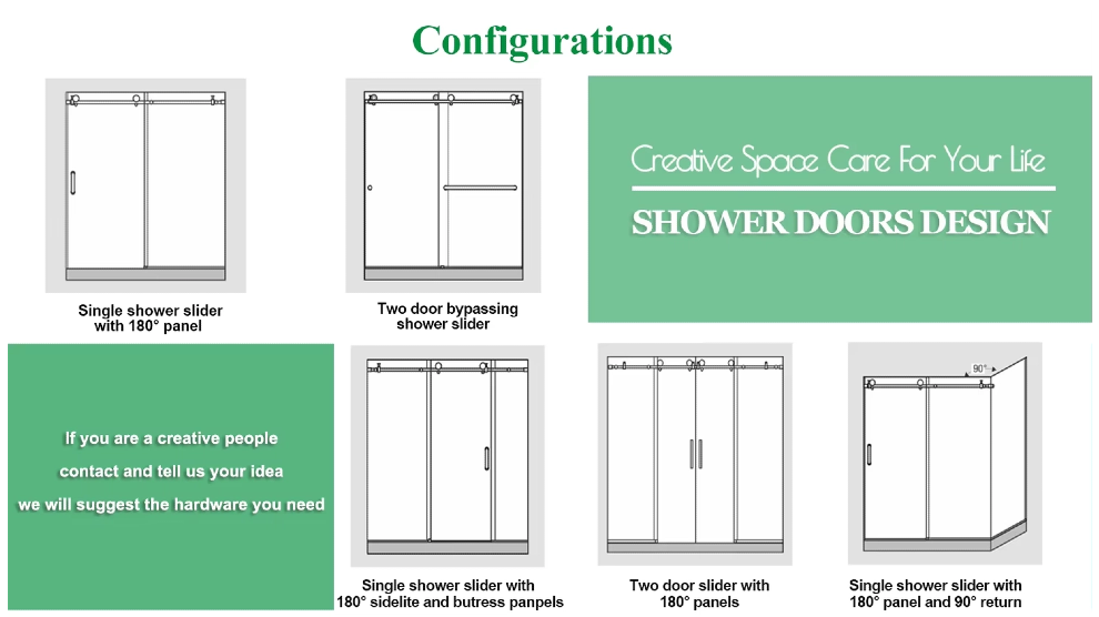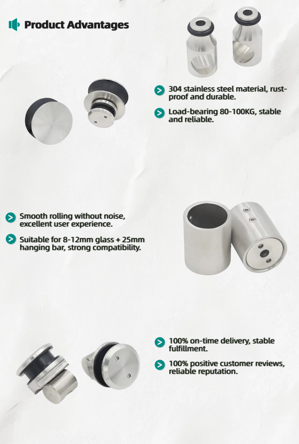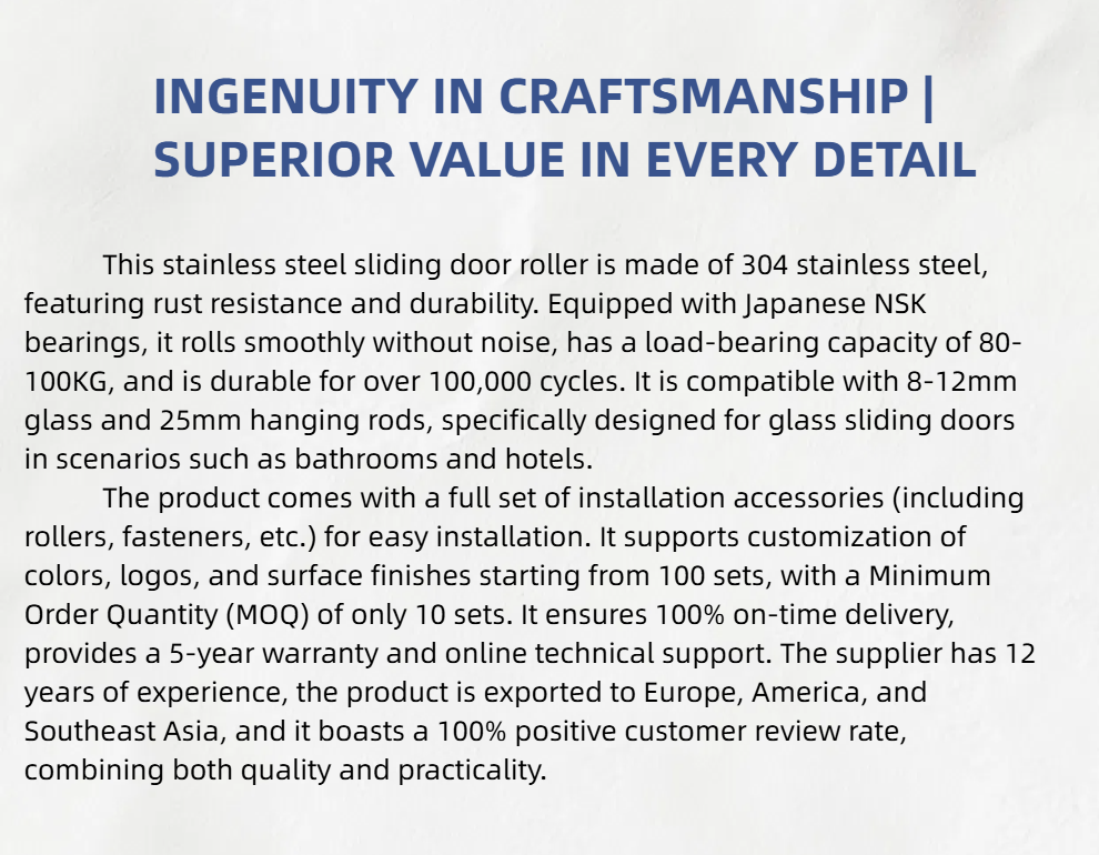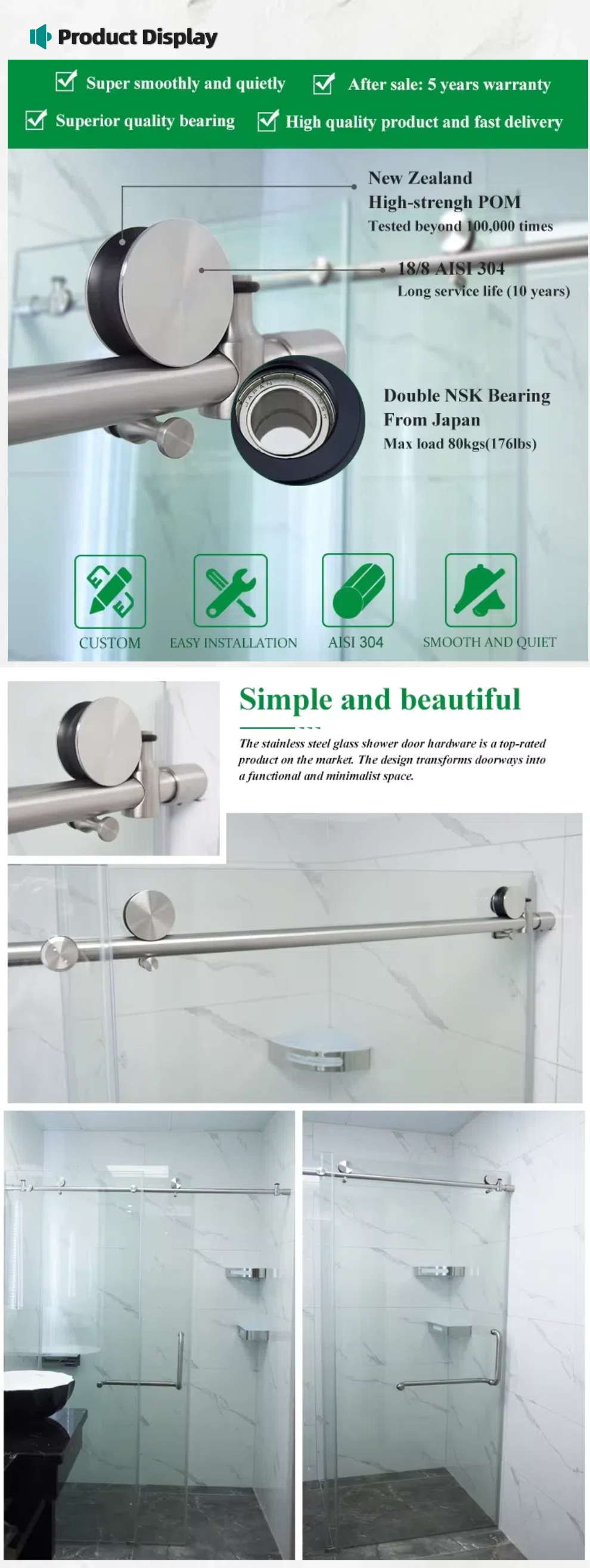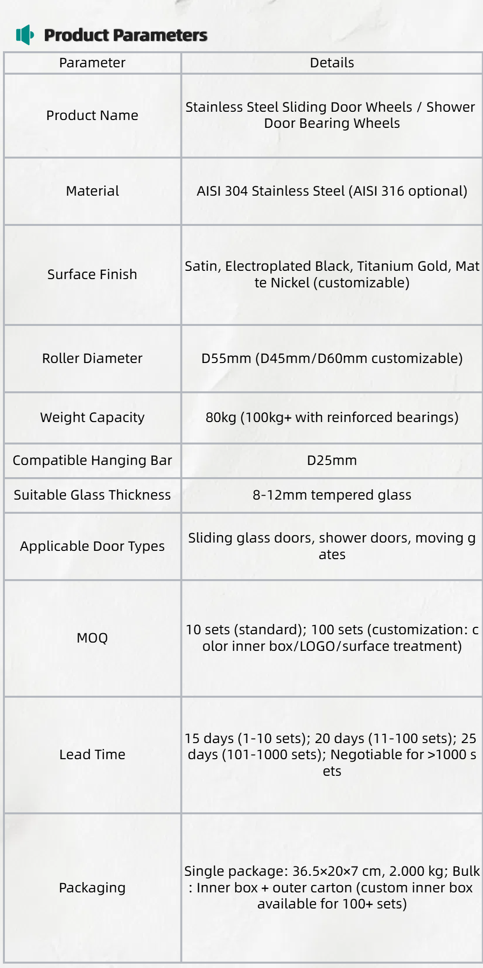 Bearing Type Selection: Offers NSK high-precision bearings (standard for ultra-smooth sliding) and reinforced double-row bearings (optional for 100kg+ load capacity, ideal for commercial shower doors)