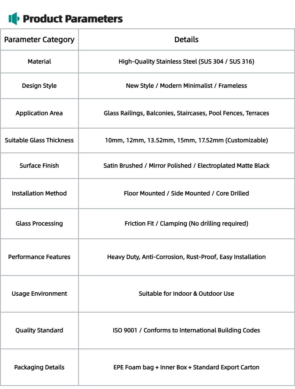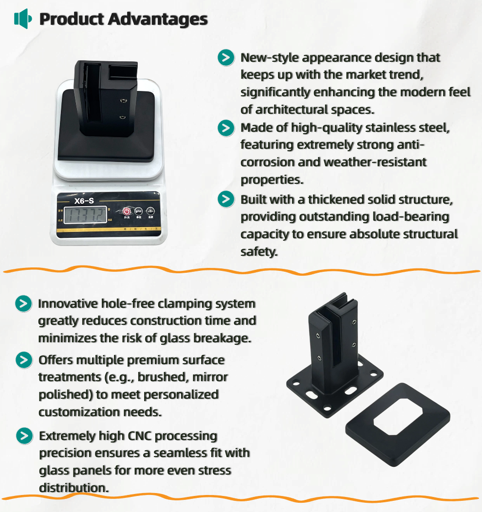 New Style Products Stainless Steel Glass Railing Clamp Balustrade Bracket Glass Railing System for Swimming Pool/Fence/Balco Innovative Design:Adopts the latest streamlined frameless design, perfectly meeting modern minimalist aesthetics. Premium Material:Made of high-grade stainless steel, sturdy, durable, and highly rust-resistant. Easy Installation:Optimized internal structure for firm clamping without complex drilling on the glass. High Applicability:Excellent versatility, widely compatible with tempered/laminated glass systems of various thicknesses. NewStyleHardware , StainlessSteelGlass , ModernBalustrade , GlassRailing Inquiry Send Email