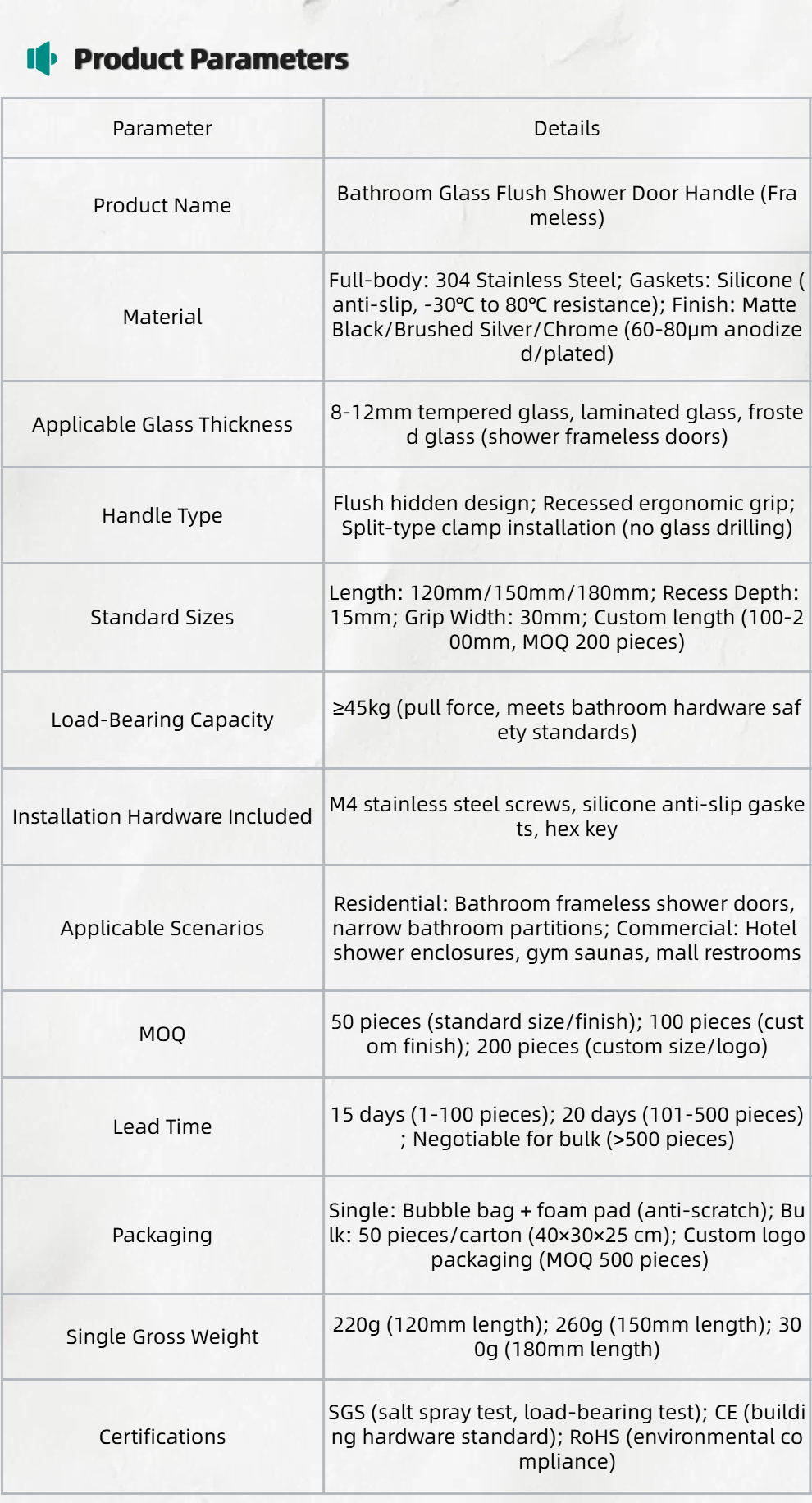 Frameless Glass Compatibility: Tailored for 8-12mm tempered/laminated glass—split-type clamp installation (no glass drilling) preserves glass integrity. Universal for left/right-handed doors, eliminat