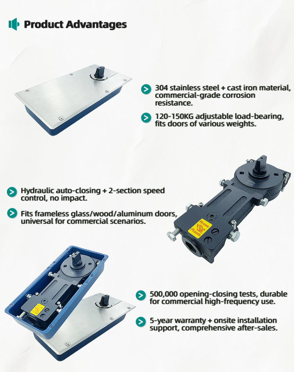 Easy Commercial Installation: Surface-mounted design eliminates deep floor grooves (saves construction time for large projects); included mounting template and anti-loose screws ensure quick, uniform