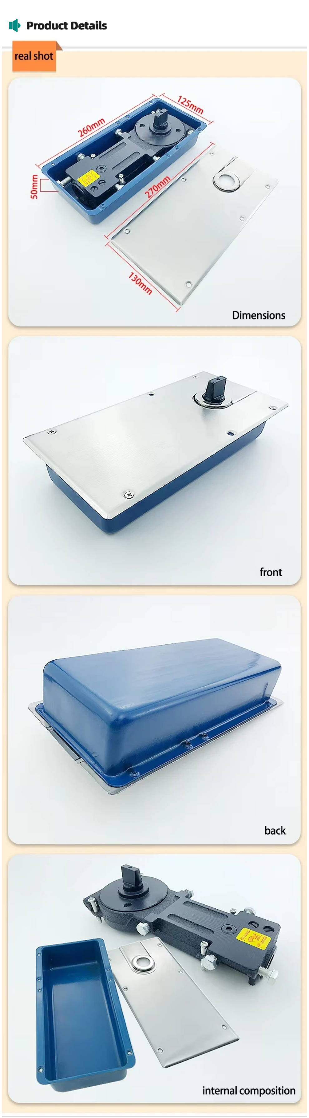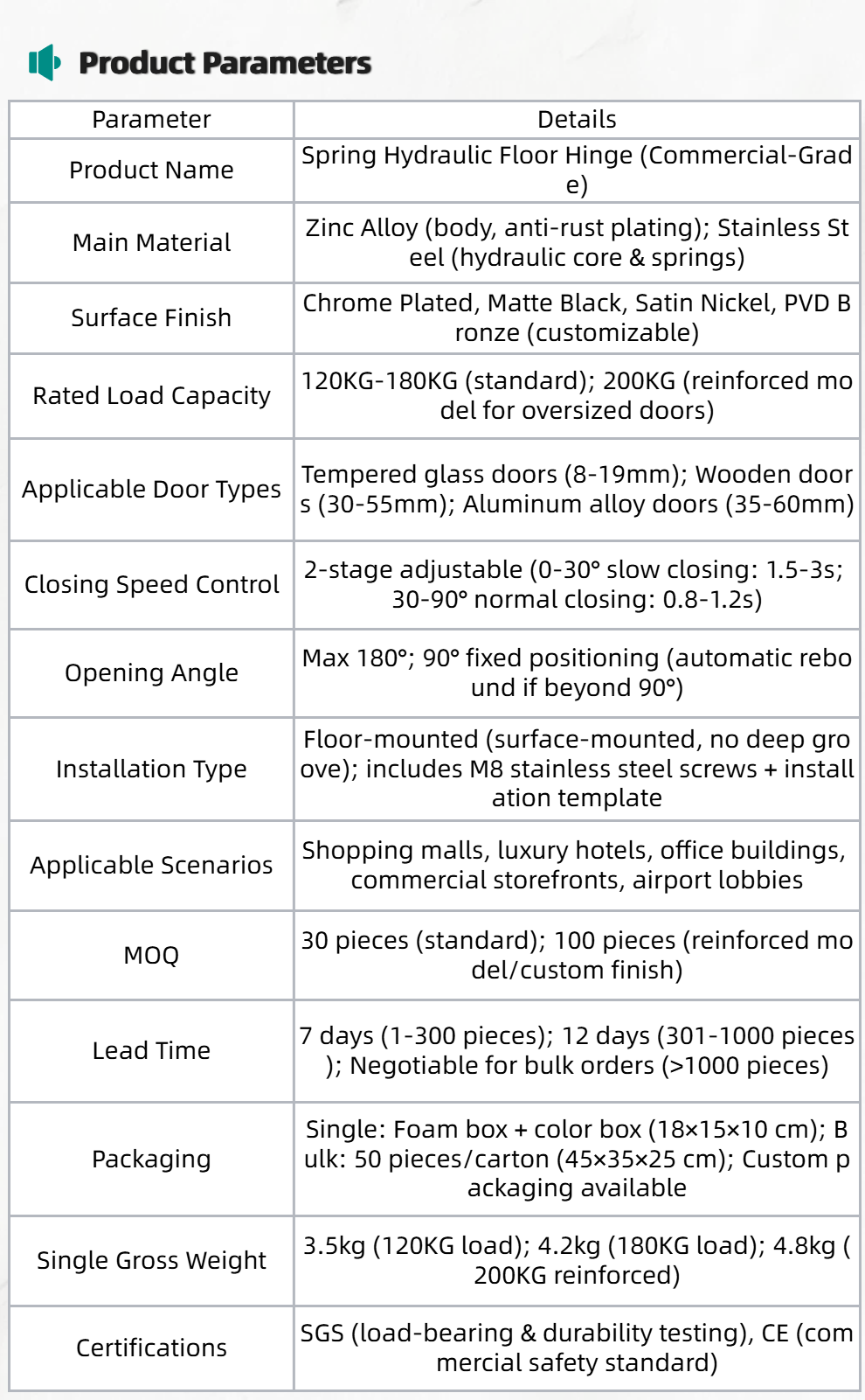 Hydraulic Spring Dual Core: Combines hydraulic damping (for silent, smooth closing) and spring rebound (for stable positioning)—avoids door slamming and maintains 90° fixed opening for goods movement