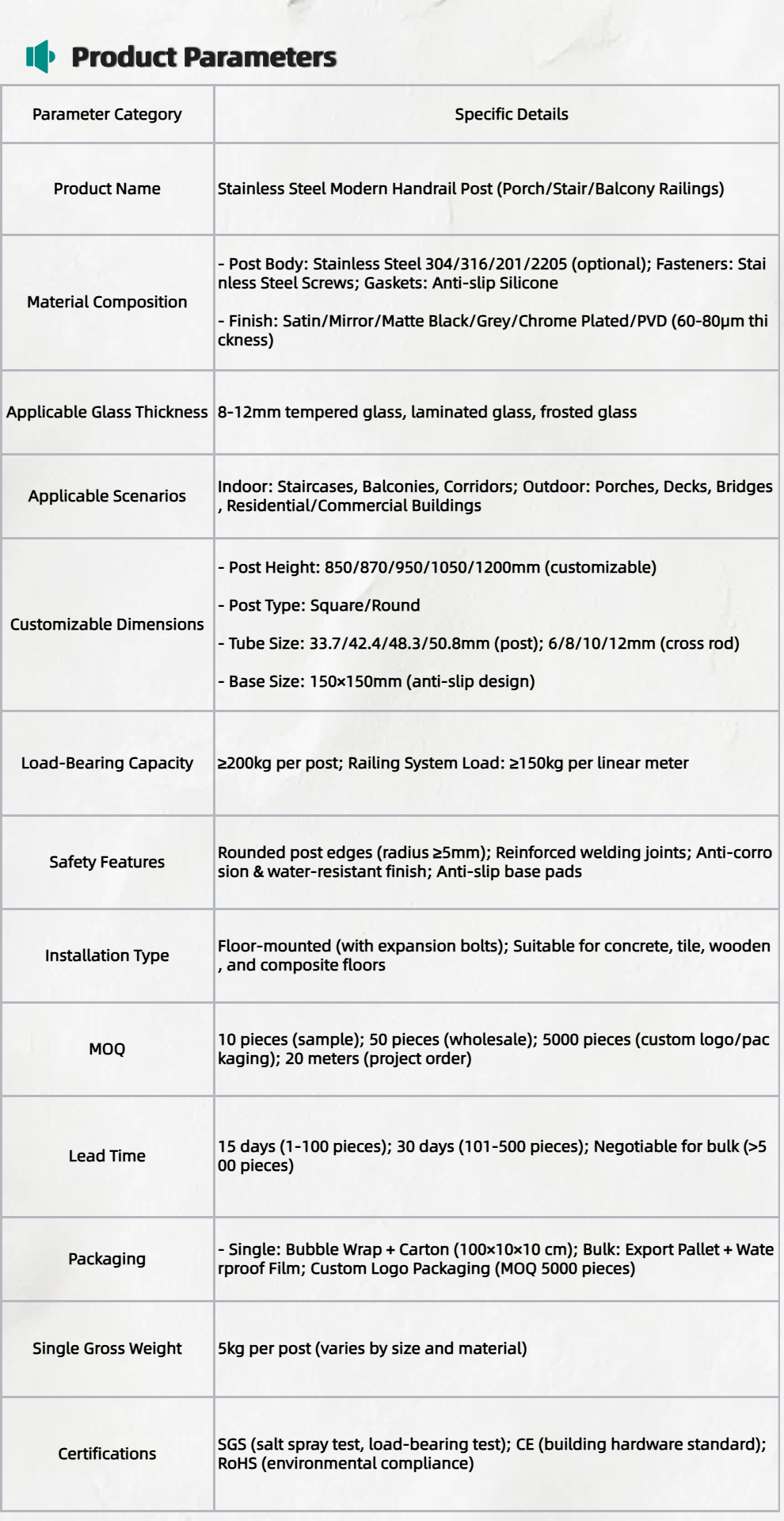 Square/Round Versatile Design: Offers square and round post options with tube sizes 33.7-50.8mm—fits modern, minimalist, and luxury decor. Compatible with 8-12mm tempered/laminated glass, adapting to
