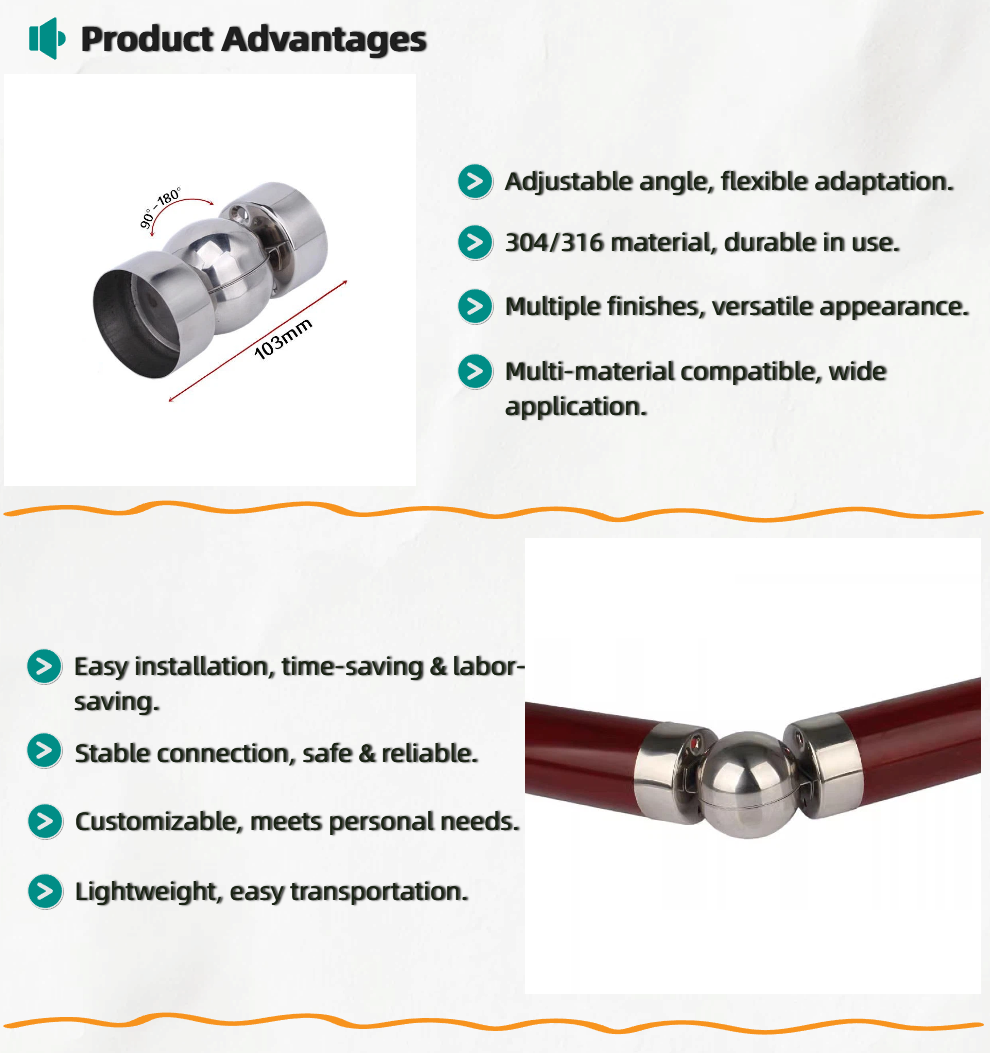 Stainless Steel Railing Handrail Connector Adjustable 90°-180° Connection Design Premium SUS304/316 Stainless Steel Material Multiple Finish Options (Mirror Polish/Satin Brush/Color) Multi-Material Compatibility (SS/PVC/Solid Wood/Aluminum) Stainless Steel Connector , Handrail Fitting , Adjustable Railing , Balcony Stair Hardware Inquiry Send Email