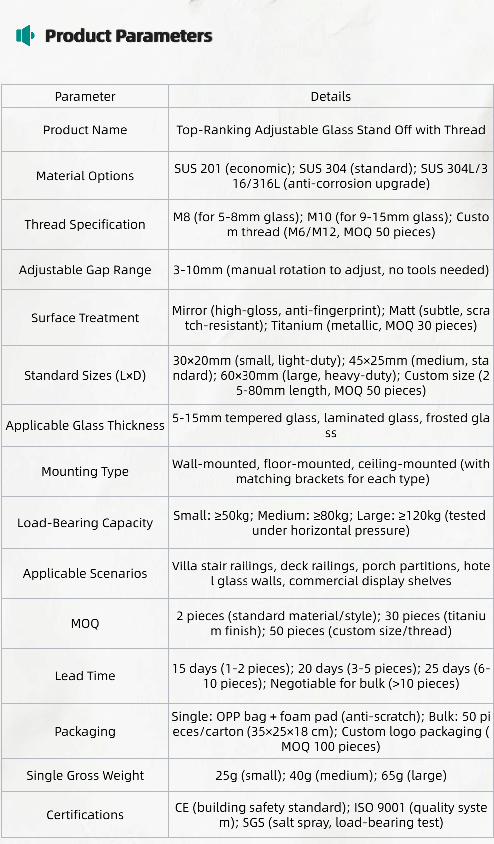 Threaded Adjustable Design: Built-in precision thread structure (M8/M10 standard) allows 3-10mm gap adjustment—adapts to uneven glass or mounting surfaces (e.g., slightly tilted walls), avoiding glass