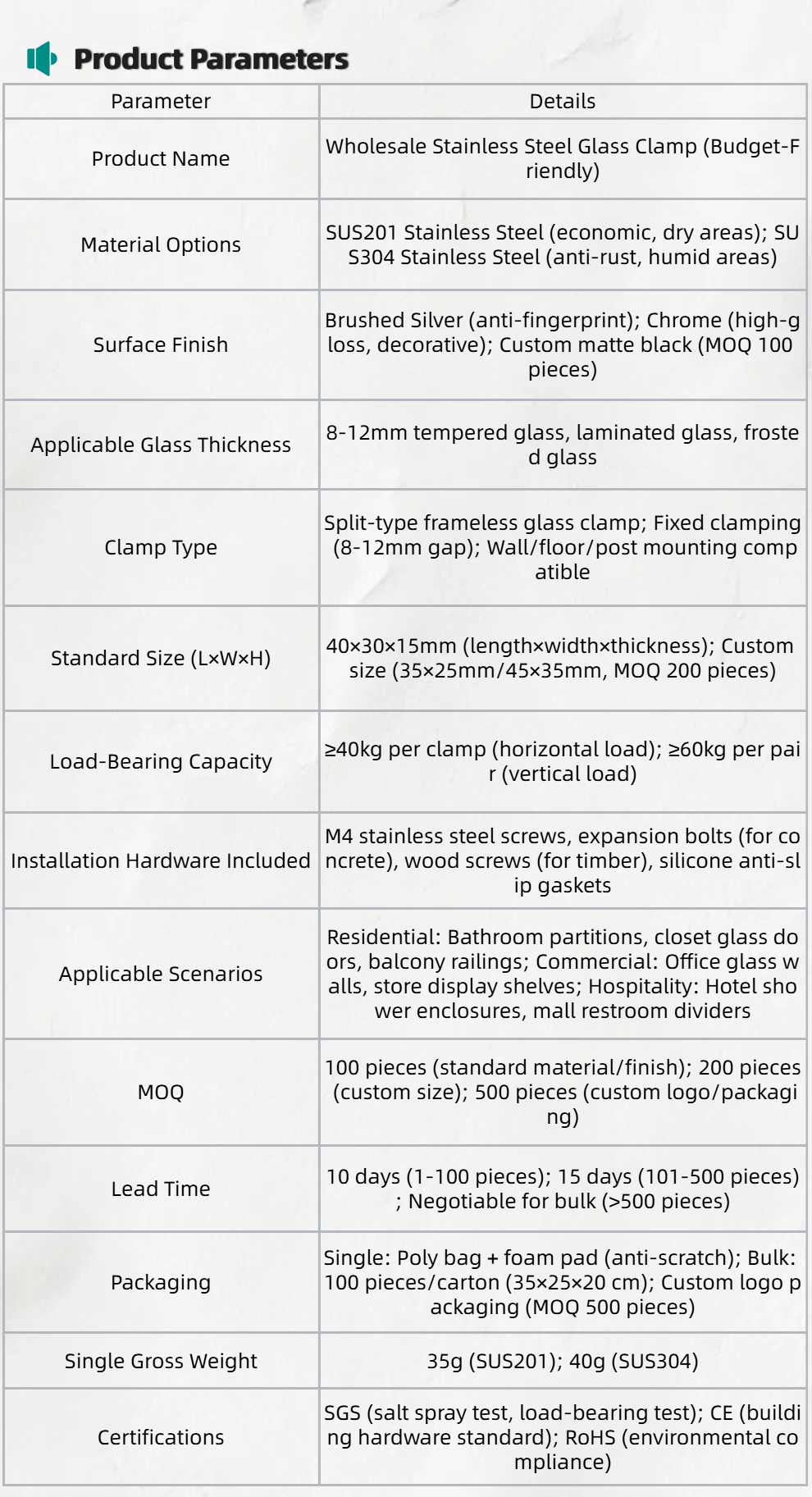 Lightweight & Easy Handling: 35g single-piece weight (SUS201) reduces shipping costs; compact 40×30×15mm size—no visual bulk, maintaining the transparency of frameless glass while ensuring stable clam