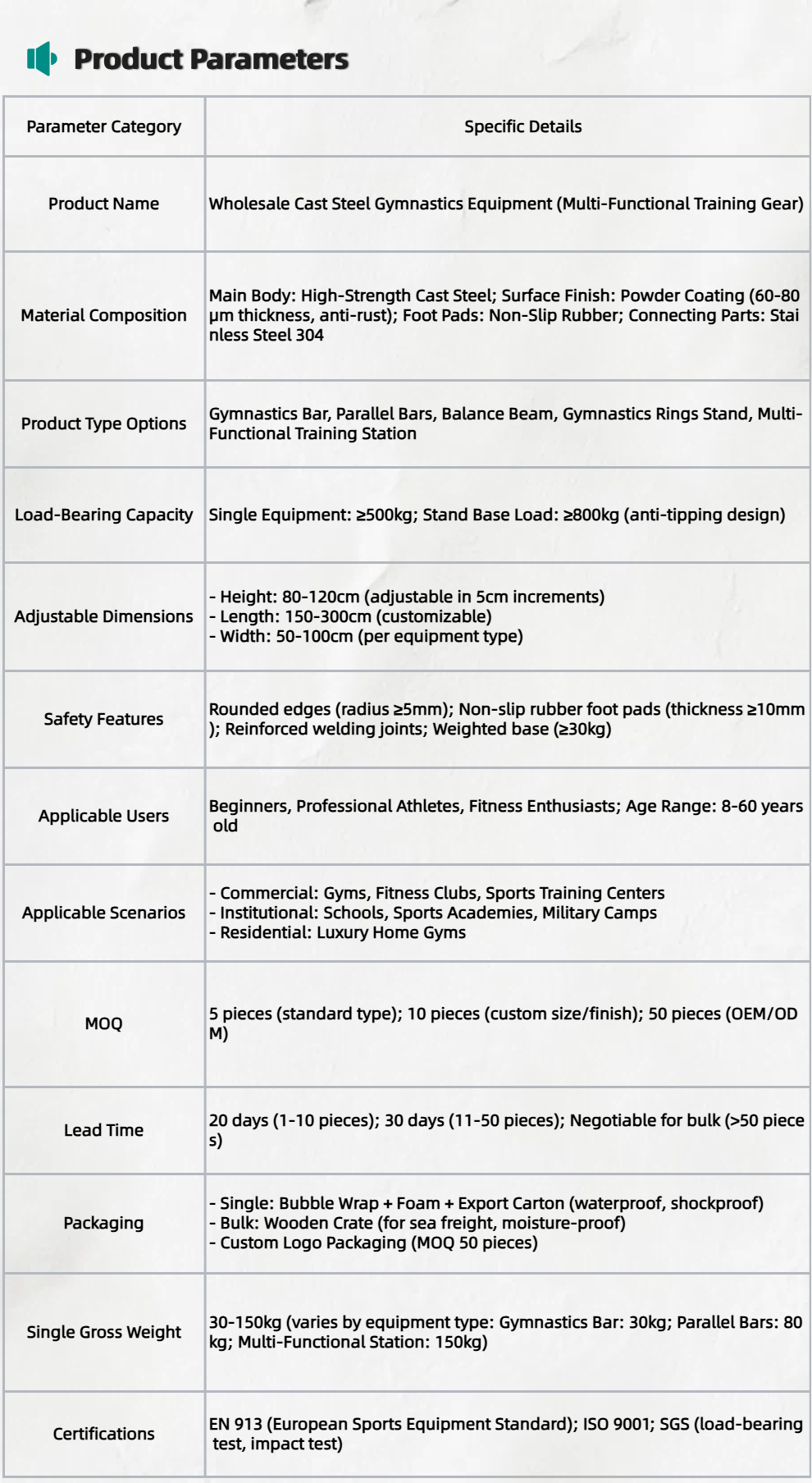Multi-Functional Training Design: Integrates multiple training modes (strength, flexibility, balance) to meet diverse gymnastics needs. Compatible with auxiliary tools (rings, bars, ropes), adapting t